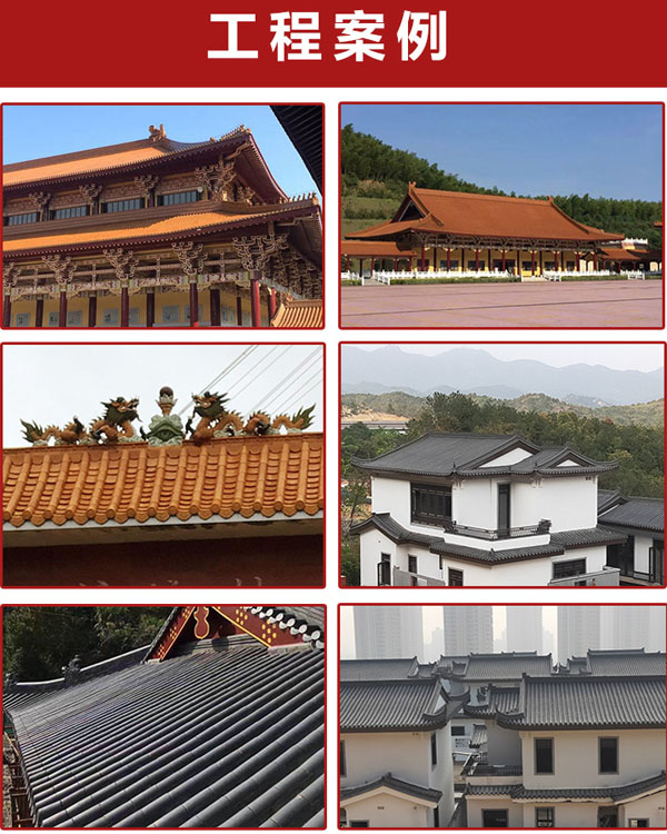 琉璃筒瓦:黃釉色的琉璃筒瓦適用于寺廟、寺院的房面裝飾,也用于唐式、明清、京派古建的房面裝飾等