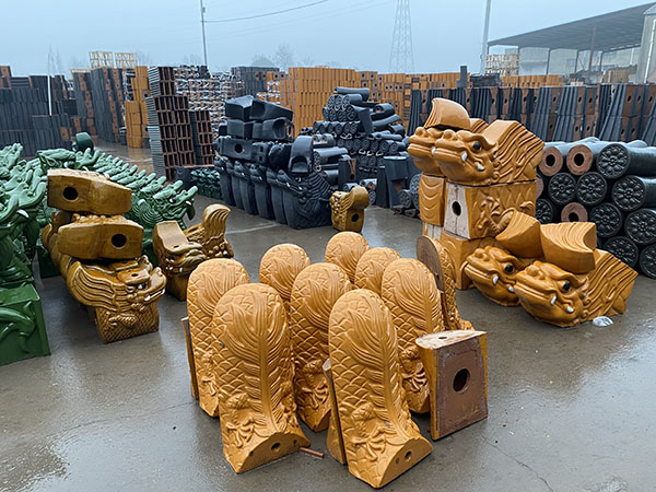 我公司生產(chǎn)仿古建筑使用的各種琉璃瓦件:板瓦(底瓦)、筒瓦(蓋瓦)、勾頭(貓頭)、滴水(流水)、脊瓦、擋勾等,其他裝飾配件有吻獸(魚尾吻、正吻、卷尾吻)、垂獸(背獸、套獸、魚尾獸)、走獸(龍、鳳、麒麟、獅)、挑角(鳳頭、卷草)、寶頂及屋頂裝飾品:龍鳳呈祥、二龍戲珠等。